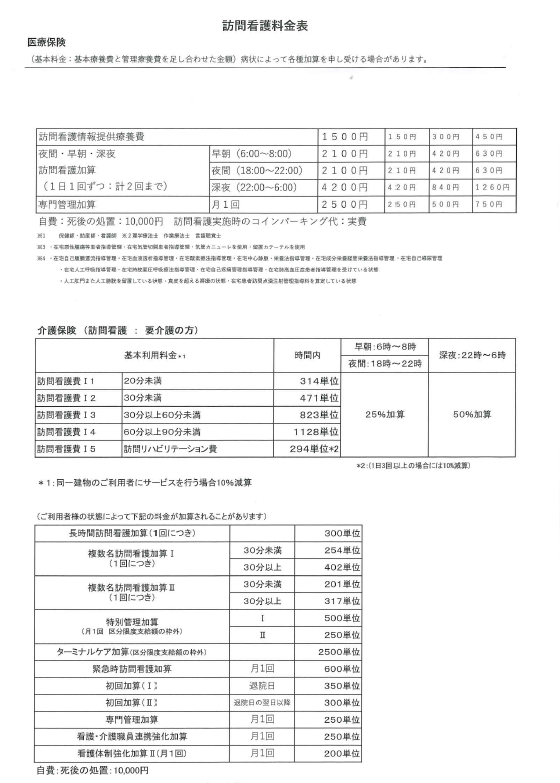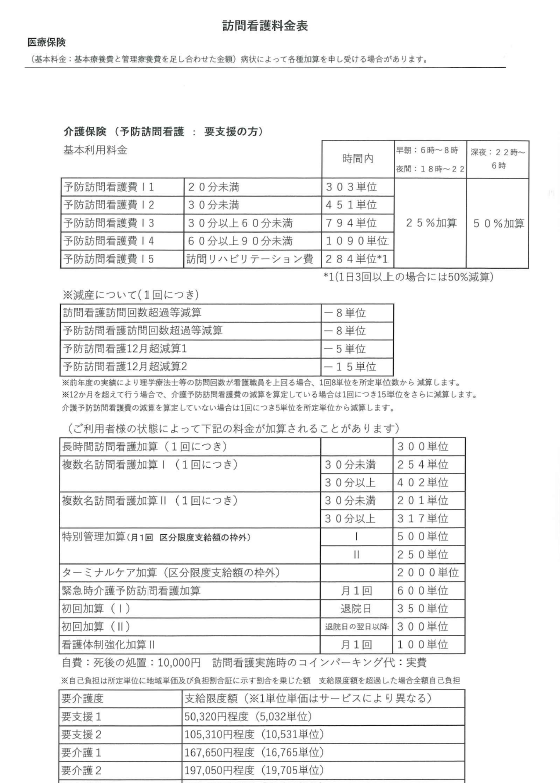 要介護度に応じて毎月の支給限度額(介護保険から支給される金額の上限)が定められています。ケアマネージャーが支給限度額の範囲内で居宅サービス計画を作成しますが、その中に訪問看護を組み入れてもらえば、訪問看護が利用できるようになります。利用者さんの自己負担は、負担割合によって異なります。支給限度額を超えた分については、全額自己負担となります。